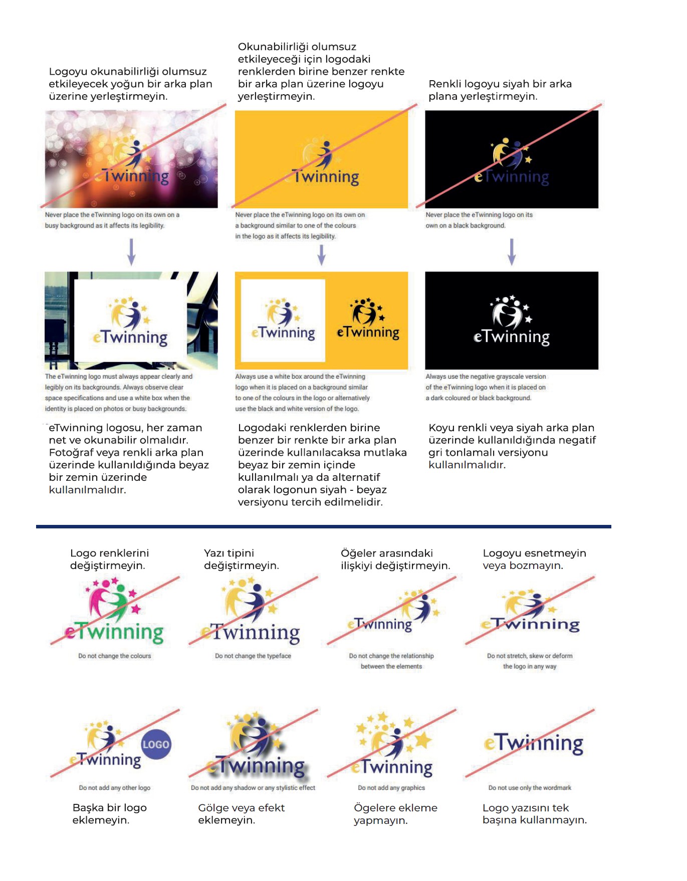 Basılı ve dijital ürünlerde eTwinning logosu kullanılabilir, Ancak bu ürünlerin bir bölümünde (en üst veya en alt tavsiye edilmektedir) 3’lü logo kullanımı yapılmalıdır.